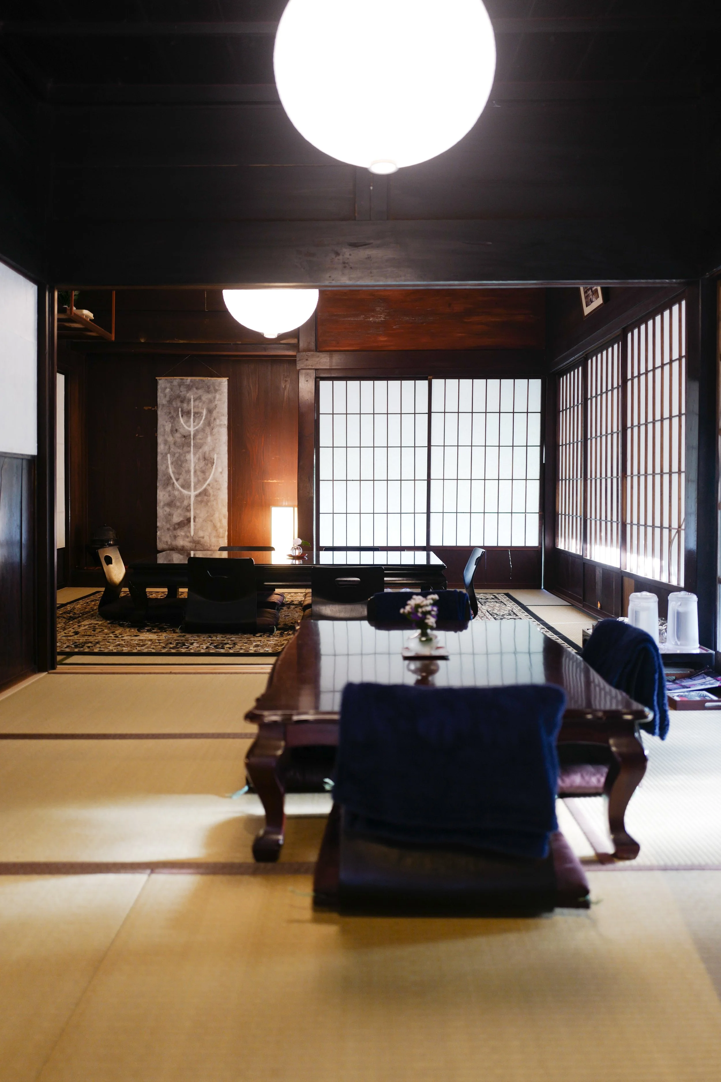 Guests at Ryunohara Hatago may enjoy meals at the main house, which was first constructed over 300 years ago. We’ve restored the interior of this house to its former glory. It sports a new floor made with loal wood, and recycled or upcycled furniture from the neighbours. The shoji screens have been repapered with handmade local washi.