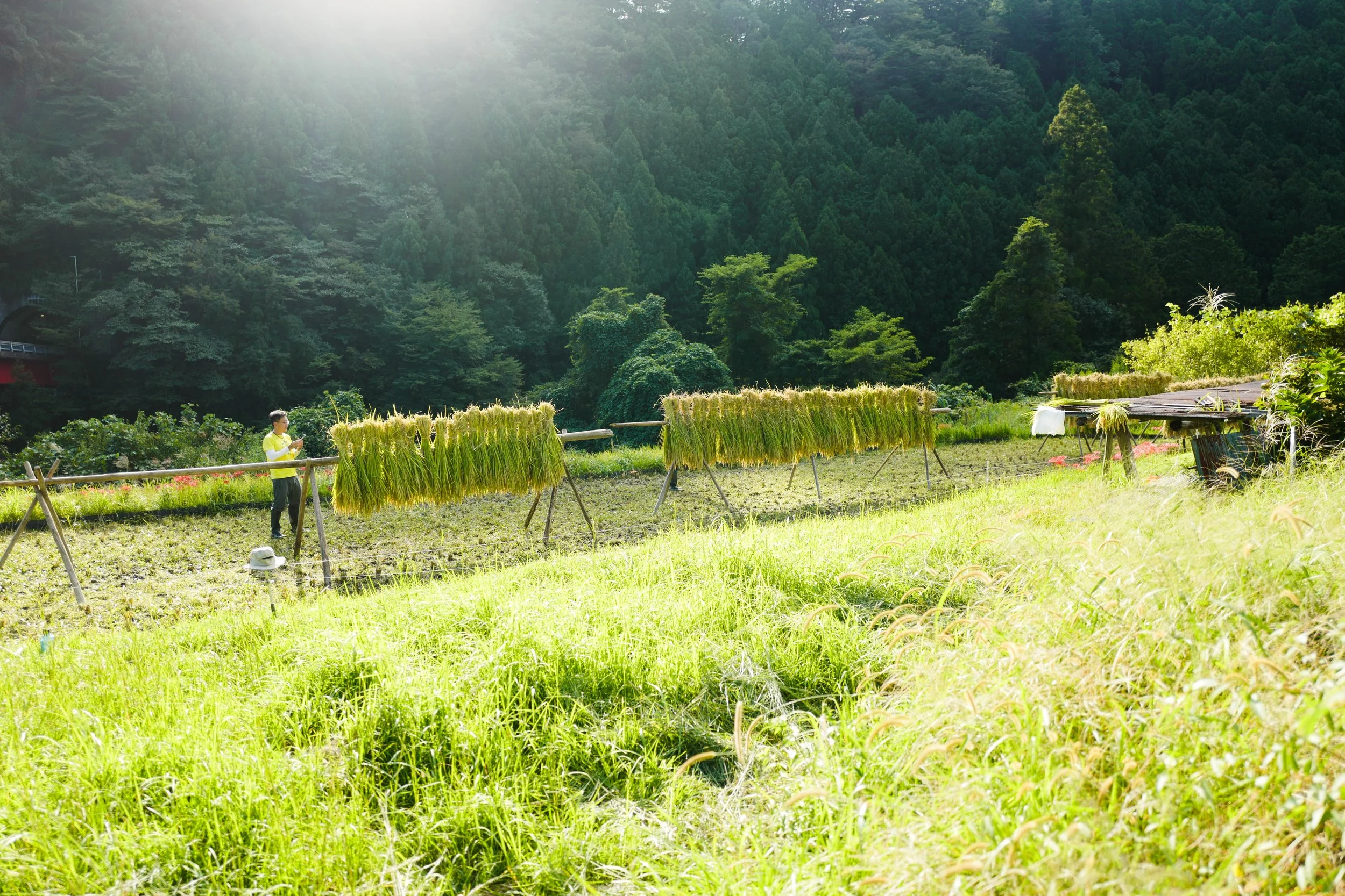 We then harvest the rice in October, and hang them up on long racks to sun dry for about 10 days. This increases the sweetness, fragrance, and flavours of the rice.