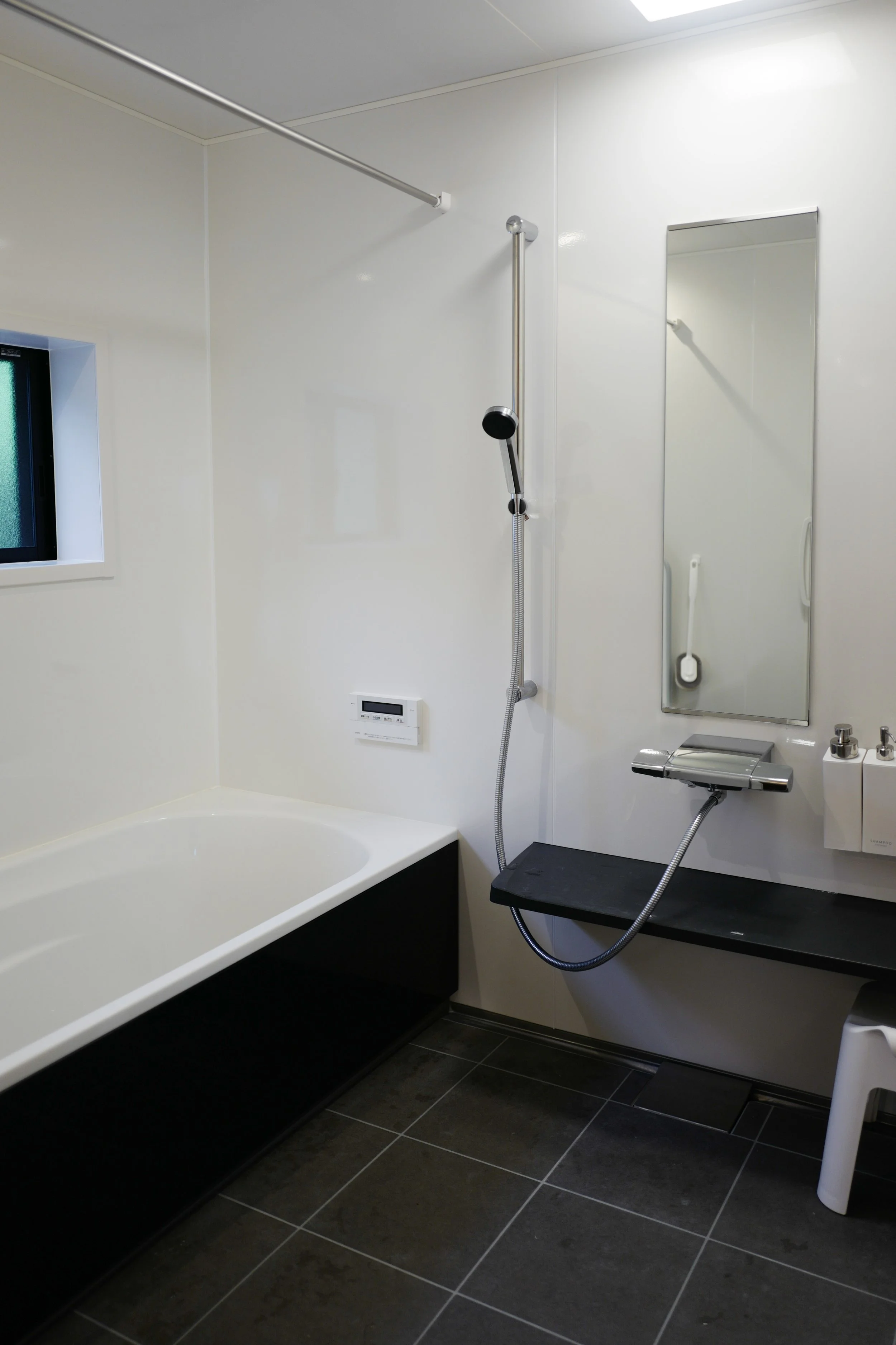 The bathtub fills up automatically and the space heater keeps you warm while you shower.