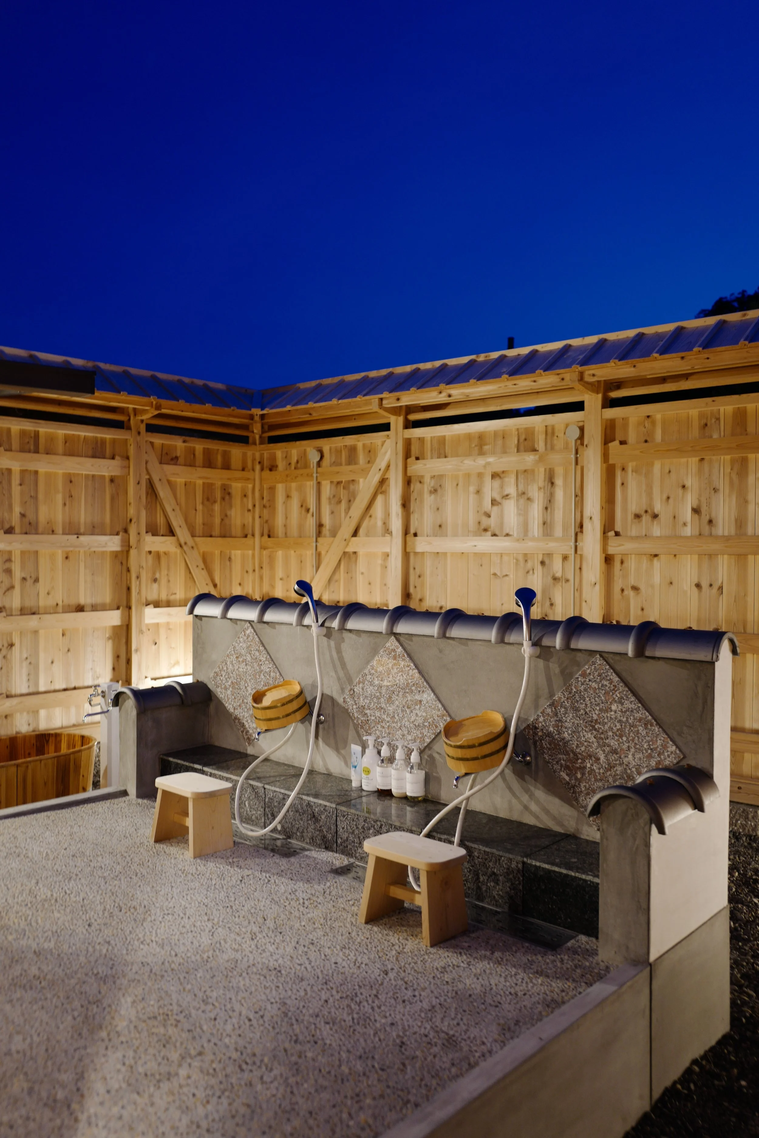 Shower under the stars. The stools and buckets are made of local Japanese cypress.