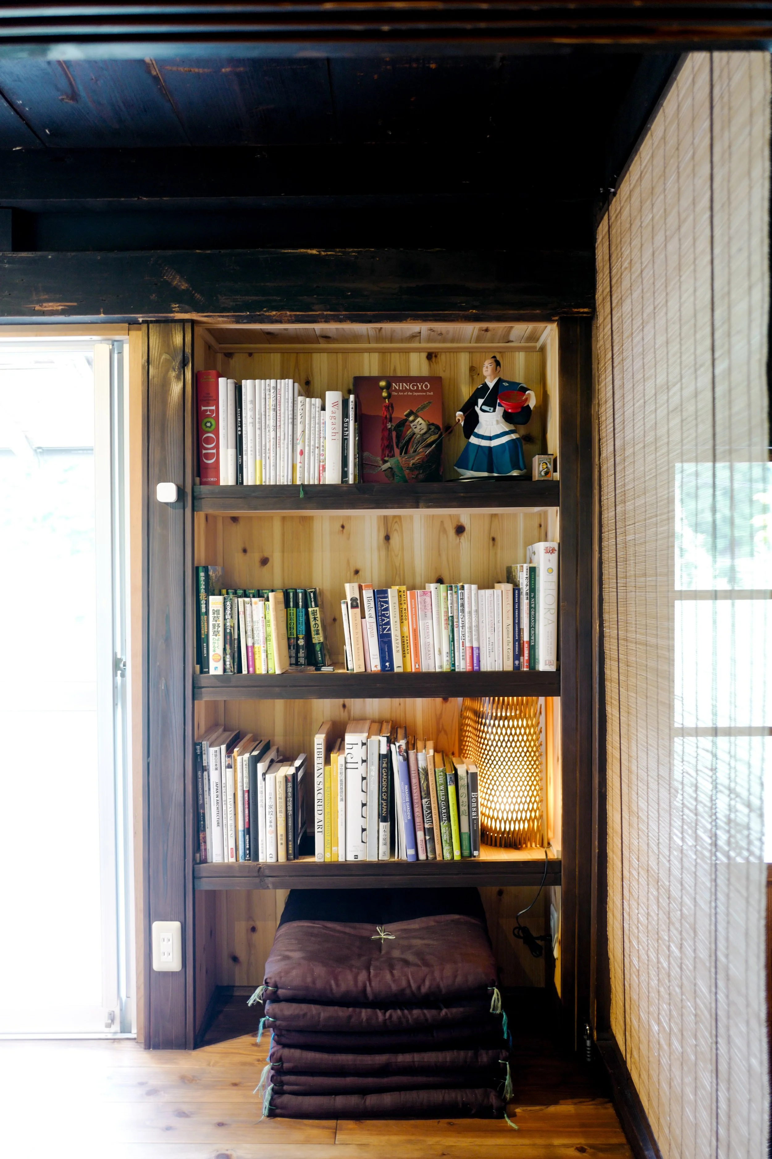 The mini library features books about Japanese architecture, gardens, art, and food.